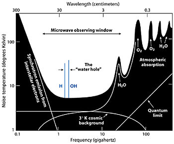 Because they've been expecting intentional transmissions, SETI scientists have historically sought for beacon signals in places like the "water hole," a narrow radio frequency band between 1.4 and 1.6 GHz, between the neutral hydrogen line and the hydroxyl (OH) line, and a natural place to transmit such a signal. They also search in the much broader "window" of relative radio quiet (an area of low "noise temperature") for emissions from nonliving astronomical sources. As seen in the picture right, from astrobiologist David Darling (Life Everywhere, 2002), this window looks to range from 800 MHz to 20 GHz when observing from the bottom of our atmosphere on Earth, and perhaps even larger when observing from space-baced radio observatories. The transcension hypothesis would suggest that the standard SETI search window is unlikely to yield fruit. We may need to go to lower frequencies, and deal with the white noise by greatly increasing sensitivity and signal detection.