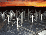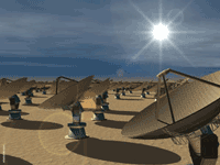 Nevertheless, ground based radiotelescopes may one day prove up to the task. SERENDIP director Dan Wertheimer says a ground-based square kilometer array (SKA)(artist's rendition left) having the equivalent collecting area of roughly ten Arecibo (Puerto Rico) telescopes, will have the power to detect unintentionally emitted television signals from nearby stars, without the need of prohibitively long signal integration times, which would be needed to attempt to search for such signals today at Arecibo. An international consortium is moving ahead on the design of Earth's first SKA, with design funds provided by the European Union. The array will be placed in either Western Australia or South Africa, and construction is estimated to begin in 2010, with initial observations in 2015, and full operation by 2020. The price tag will be only $1.6 billion, an affordable price for the knowledge that will come with this kind of sensitivity. See the SKA website for more on this project.